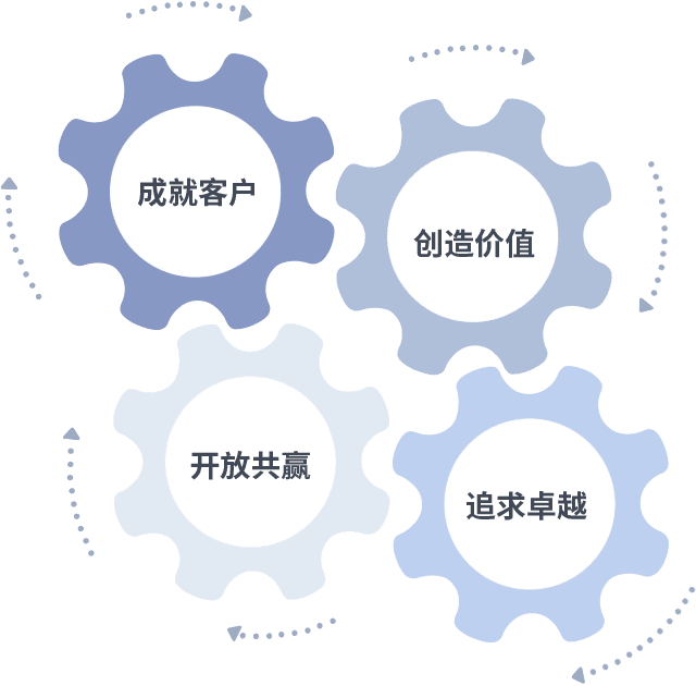 成就客户是一切决策的出发点,,,,创造价值是衡量所有工作的标准,,追求卓越是我们做事做人的态度,,,开放共赢是我们的格局也是最终的结果。。。价值观的齿轮环环相扣,,,推动着组织里的每个人不断向前。。。