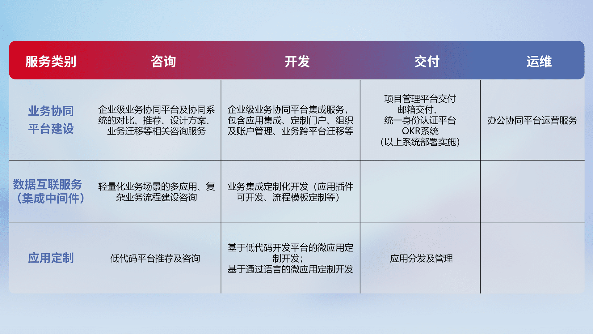 针对钉钉、、、企微、、、IDaas等平台级产品提供产品的规划、、、方案、、、、交付、、、定制化开发等服务,,,,实现如统一协同办公、、、智能客户服务、、混合会议管理、、智能数据查询、、、等业务场景,,实现数字化转型。。。。